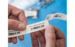 Person holding printed labels showing product information and barcodes